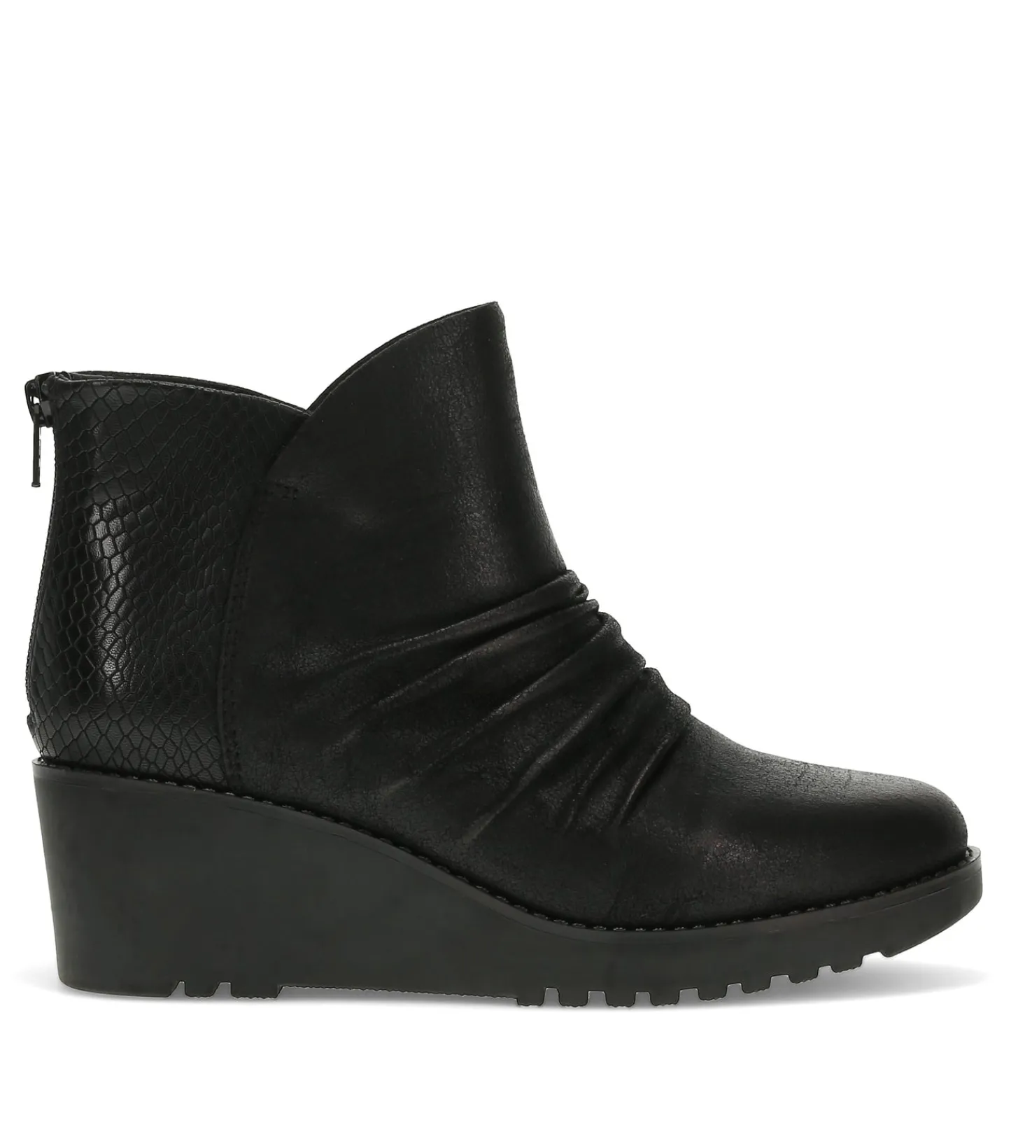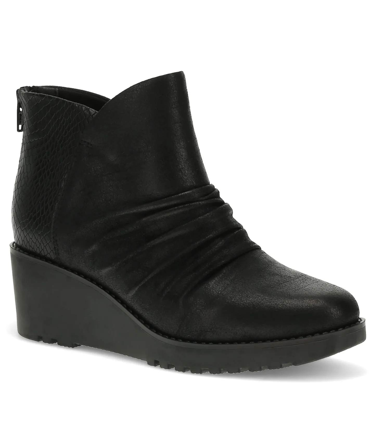 The Baretraps Wichita Ruched Wedge Bootie is a stylish footwear option crafted with your comfort and sustainability in mind. Featuring a 100% vegan construction, these booties are designed to be kind to both your feet and the environment.The cushioned insole provides all-day support, while the treaded outsole ensures stable footing on a variety of surfaces. For easy on and off, the back zipper closure makes it a breeze to slip into these versatile booties.Elevating the design, the Wichita boasts embossing on the back quarter and a microfiber vamp, creating a visually appealing and textured look. The round toe and ruching on the forefoot add a touch of contemporary flair, making these booties a fashionable choice for any occasion.