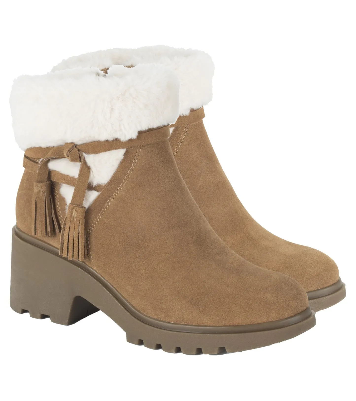 Look hot when the weather gets cold in the Baretraps Dolors Cold Weather Booties. Usually suede-finished styles are a no-go for winter, but Baretraps’ Weatherproof Technology has a water resistant coating and a lugged, slip-resistant sole means these are ready to tackle the elements. Function gives way to fashion with the faux shearling cuff and playful tassel detail. Paired with your favorite leggings they’ll give off that relaxed après-ski vibe or match with an above the knee skirt for a cool look while your feet stay warm.