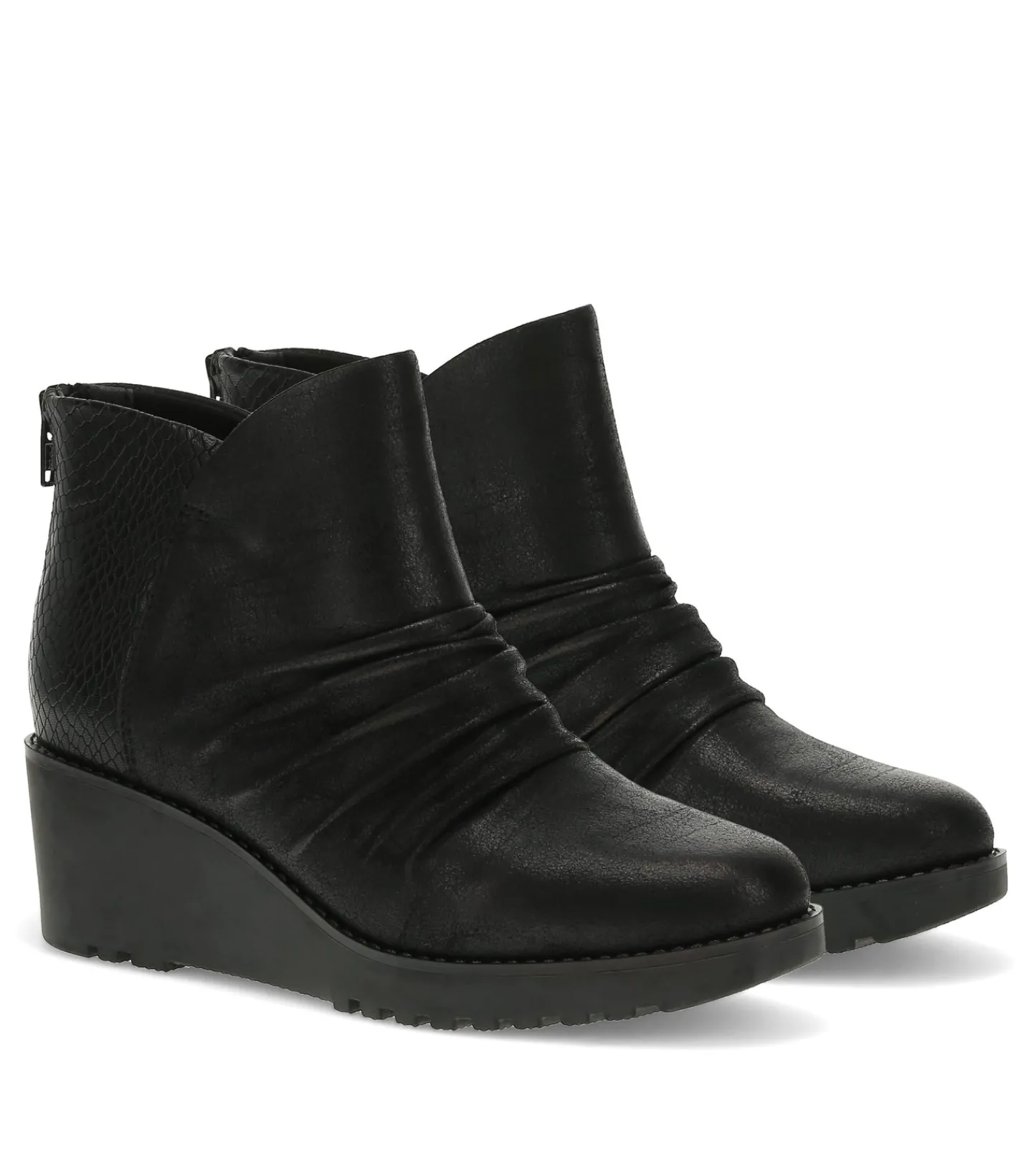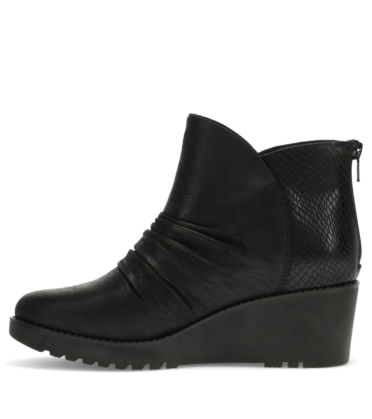 The Baretraps Wichita Ruched Wedge Bootie is a stylish footwear option crafted with your comfort and sustainability in mind. Featuring a 100% vegan construction, these booties are designed to be kind to both your feet and the environment.The cushioned insole provides all-day support, while the treaded outsole ensures stable footing on a variety of surfaces. For easy on and off, the back zipper closure makes it a breeze to slip into these versatile booties.Elevating the design, the Wichita boasts embossing on the back quarter and a microfiber vamp, creating a visually appealing and textured look. The round toe and ruching on the forefoot add a touch of contemporary flair, making these booties a fashionable choice for any occasion.