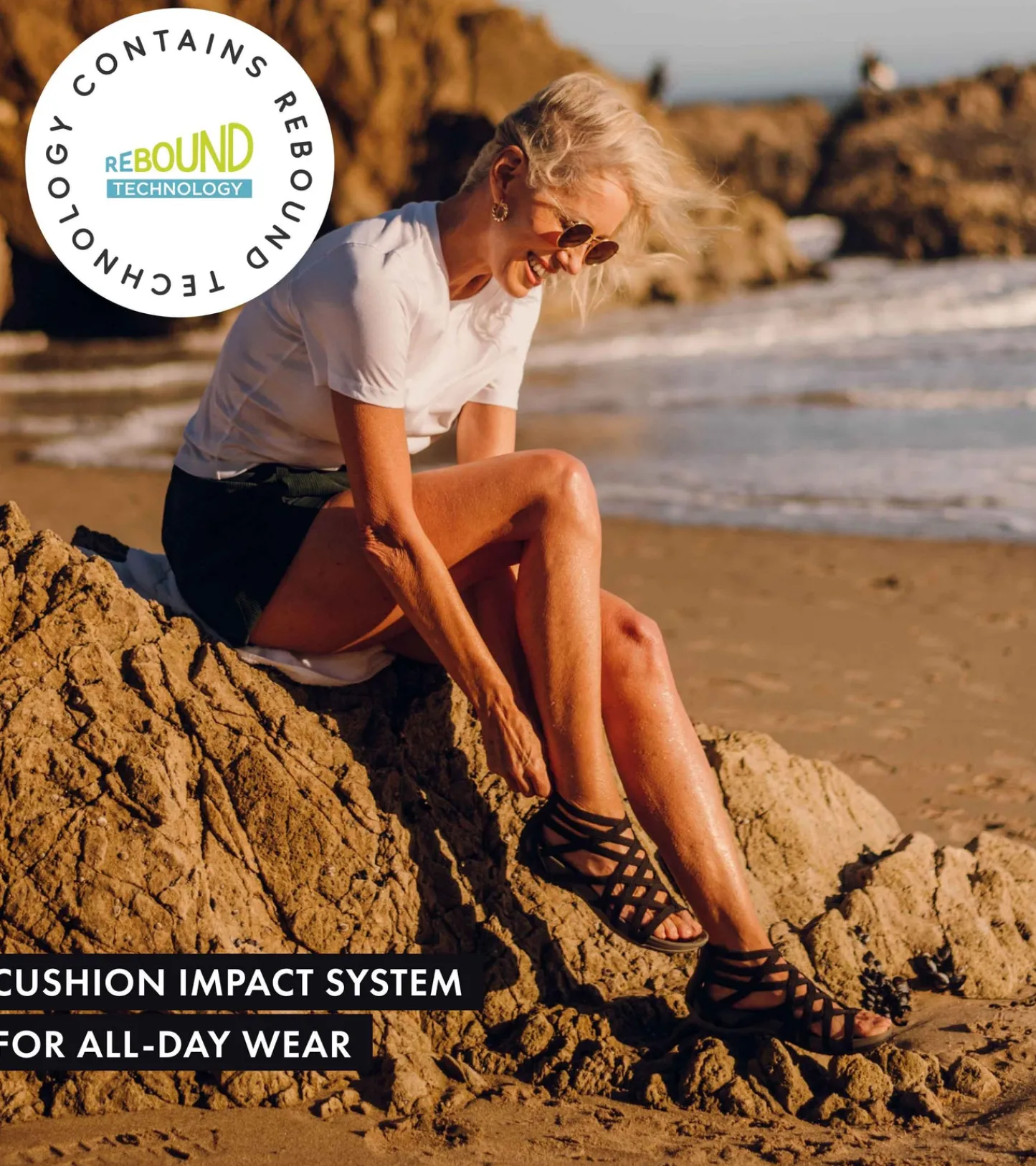 This stretchy, strappy sandal delivers athleisure comfort and style with our Rebound Technology. Its vibration-absorbing molded outsole is textured to guard against slipping, while its comfortable cushioned insole is equipped with a protective antimicrobial shield. With a zip of the Samina’s back-zip closure, you’ll be ready to tackle your busy day effortlessly.